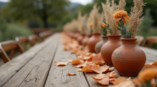 Terracotta elements provide earthy, rustic elegance through their warm, matte surfaces and handcrafted irregularities. Terracotta vessels, tiles as table numbers, or pottery as votive holders connect the celebration to artisanal traditions and natural clay origins. These pieces work particularly well in outdoor settings where they visually bridge designed elements and the natural environment.