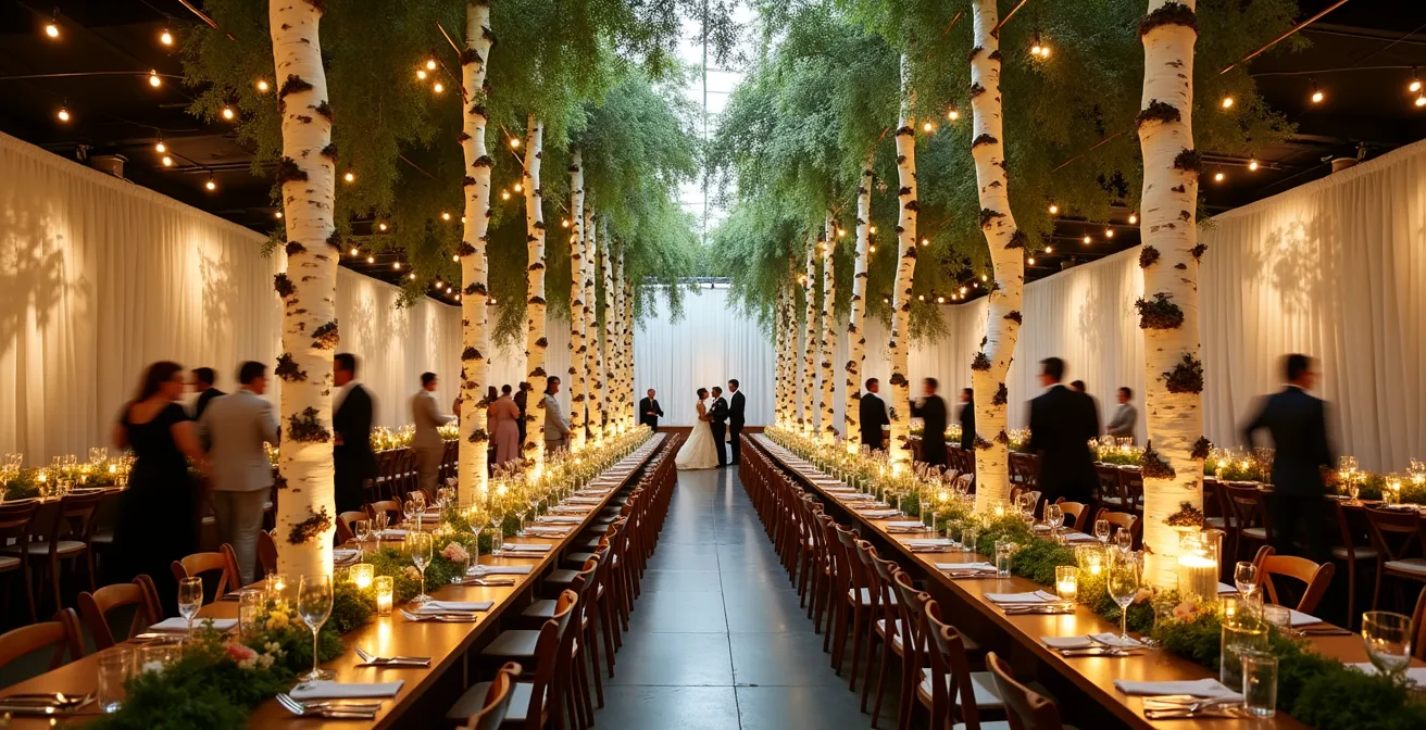 The real value of tall trees lies in their ability to solve multiple design problems at once. They fill empty vertical space in venues with high ceilings, help obscure less-desirable architectural features, and create a natural framework for lighting elements. They provide a much higher return on atmospheric investment, shifting the focus from decorating tables to building a world. Rather than dotting a room with flowers, you are enveloping your guests in a forest.