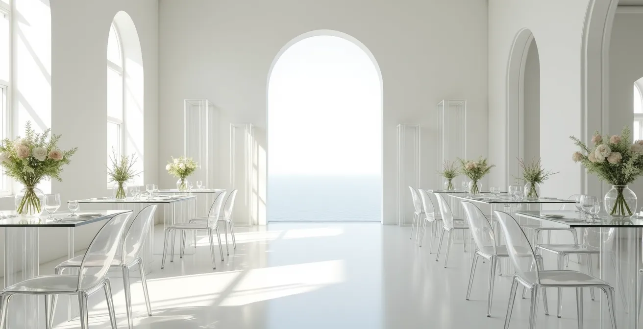 This can be a tremendous asset. Ghost chairs, for example, don’t cast dark shadows under the table, which means the room feels brighter and more open. They work beautifully in outdoor or sun-drenched settings, reflecting the sky and scenery and enhancing the connection to the outdoors. Because they are made from high-quality, water-resistant acrylic, they maintain their pristine appearance even if there’s a passing shower, making them a reliable choice for indoor-outdoor venues.