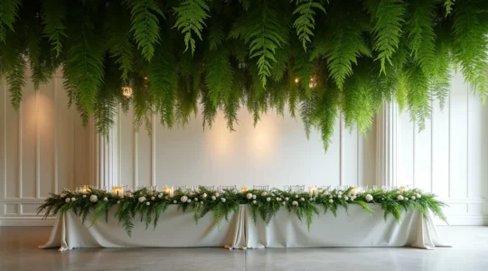 Cascading ferns—particularly leather leaf and tree ferns—excel at adding vertical dimension and softening rigid structures like chuppahs, arches, and table edges. Their natural downward growth creates elegant movement without appearing messy or overgrown.